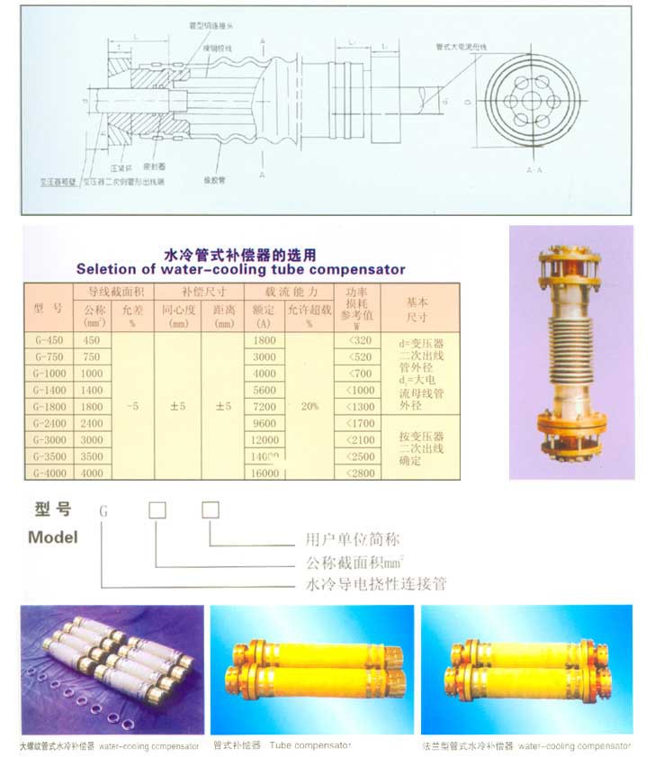用于礦熱爐(電石爐、鐵合金爐、工業(yè)硅爐、黃磷爐等)短網(wǎng)系統(tǒng),既用于變壓器二次出線端與固定銅管的連接(補(bǔ)償器A型接頭并可用作電弧爐、鋼鐵爐補(bǔ)償器),也用于固定銅管與爐內(nèi)可動(dòng)銅管(連接銅瓦)之間的連接一水冷電纜。其中補(bǔ)償器可補(bǔ)償安裝誤差,熱脹冷縮和吸收短網(wǎng)的電磁力引起的振動(dòng)